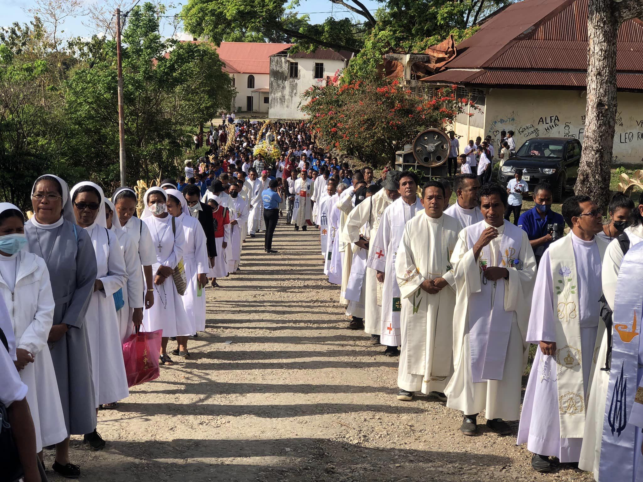 Antes Celebração Eucaristia, hahu ho processão lori ilas Nain Feto Husi Paróquia ba Santuário.